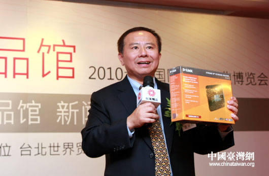 友訊科技公司執(zhí)行長(zhǎng)曹安邦向大家介紹自己公司生產(chǎn)的精品路由器。(中國(guó)臺(tái)灣網(wǎng) 鐘寶華 攝)