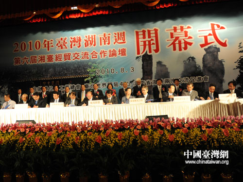 8月3日下午,由湖南省海峽兩岸交流促進(jìn)會(huì)、臺(tái)灣工業(yè)總會(huì)和臺(tái)北世界貿(mào)易中心聯(lián)合主辦的“2010年臺(tái)灣湖南周”暨第六屆湘臺(tái)經(jīng)貿(mào)交流合作論壇在臺(tái)北圓山飯店隆重開(kāi)幕,湘臺(tái)兩地簽訂合作備忘錄、項(xiàng)目合作協(xié)議和采購(gòu)協(xié)議24項(xiàng)。(湖南省臺(tái)辦 李蘭 攝)