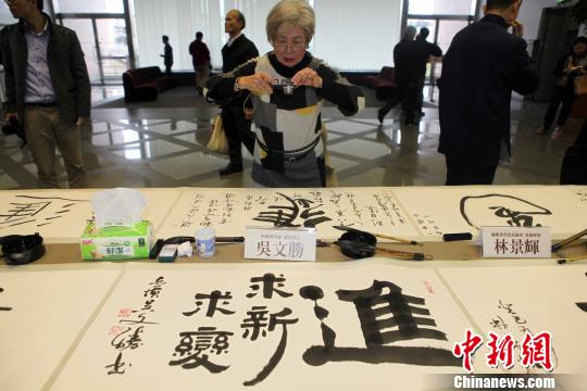 兩岸年度漢字揭曉后,閩臺知名書法家現場潑墨揮毫,書寫各種字體的“進”字。臺灣書法家張炳煌的附注為“兩岸交融同躍進,九州鼎盛享安和”,基隆市書道會理事長張明萊則寄語“書寫兩岸民意,共同推進和平繁榮”。