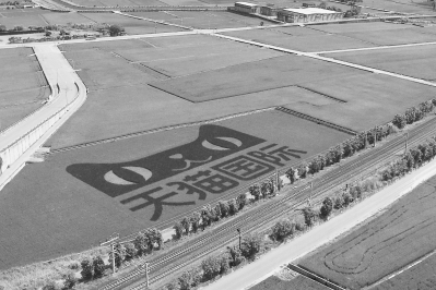 在碧綠的田野上繪出多姿多彩的“稻田畫”,該是多么神奇的事兒。近日,記者來到臺灣花蓮玉里鄉探訪,只見一望無際的綠油油稻浪中浮現出紫黑的天貓圖案和“天貓國際”四個大字。