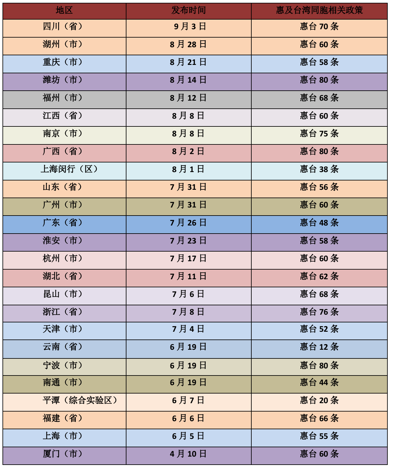 這些省市結合自身優勢特色,針對本地臺胞臺企的特點和需求,出臺惠及臺灣同胞的相關政策措施,可謂是“量身定制”。這些政策涉及領域從創業、就業、學習到生活,其中不乏有亮點顯現。點擊政策名稱,可以鏈接到政策全文喲!