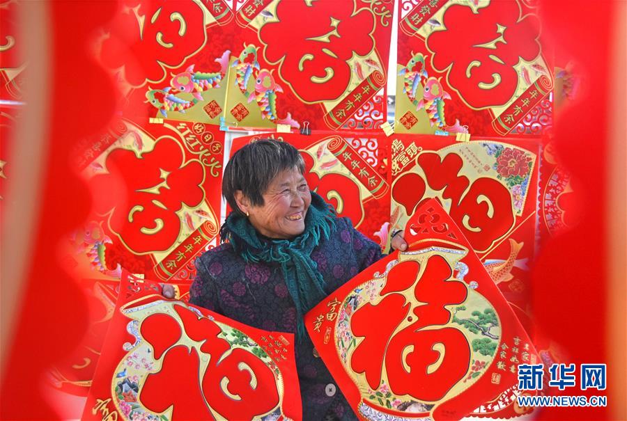 2月13日,市民在山東省沂源縣歷山街道年貨大集上選購(gòu)福字。春節(jié)將至,各地紅紅火火,一派喜氣景象。 新華社發(fā)(趙東山 攝)