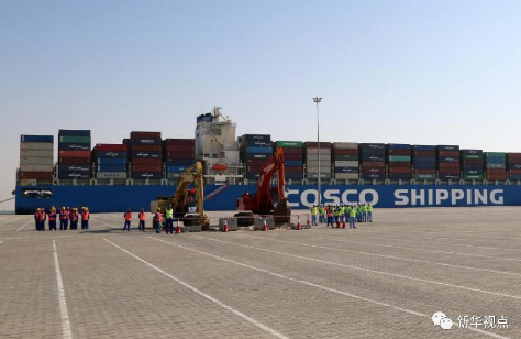 2017年11月5日在阿聯酋拍攝的中遠海運港口阿布扎比碼頭正式動工暨場站租賃簽約儀式現場。 新華社記者蘇小坡攝