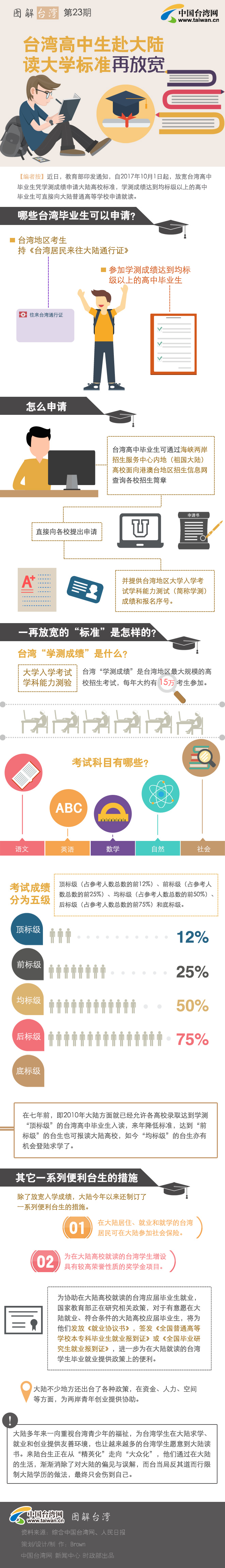 【編者按】近日,教育部印發通知,自2017年10月1日起,放寬臺灣高中畢業生憑學測成績申請大陸高校標準,學測成績達到均標級以上的高中畢業生可直接向大陸普通高等學校申請就讀。