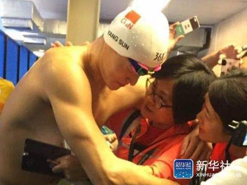 8月6日,中國選手孫楊在比賽后。孫楊在賽后接受記者采訪時情緒略有低落,雖然他認為自己的訓練實力應該能拿冠軍,輸了也是運氣使然,有點可惜,他也說了”沒關系“。但孫楊在見到一熟悉的記者時,忍不住了,緊緊抱住她長達數十秒,再一抬頭已是滿臉的淚水。新華社記者 王春燕 攝