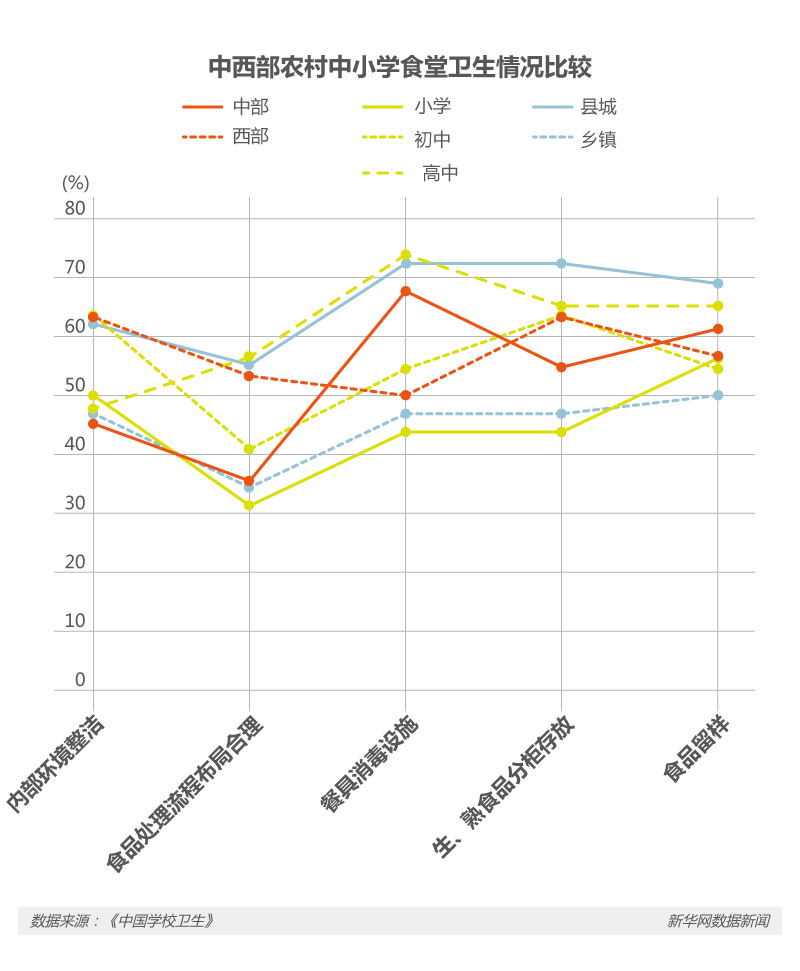 我國中西部農村中小學食堂普遍存在衛生與管理問題。整體來看,縣城學校的情況要明顯好于農村,而中部城市在部分指標卻落后于西部城市,高中學校食堂衛生條件整體看要好于小學、初中。