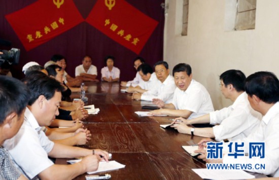 2013年7月11日至12日,中共中央總書記、國家主席、中央軍委主席習近平在河北省調研指導黨的群眾路線教育實踐活動。這是習近平在平山縣西柏坡九月會議舊址同縣鄉村干部、老黨員和群眾代表座談。新華社記者 鞠鵬 攝
