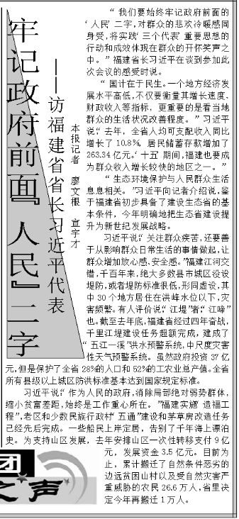 “我們要始終牢記政府前面的‘人民’二字,對群眾的悲歡冷暖感同身受。”2002年3月4日,人民日報兩會特刊的“代表團之聲”欄目里,刊發了對時任福建省省長的習近平代表的采訪,標題是《牢記政府面前“人民”二字》。