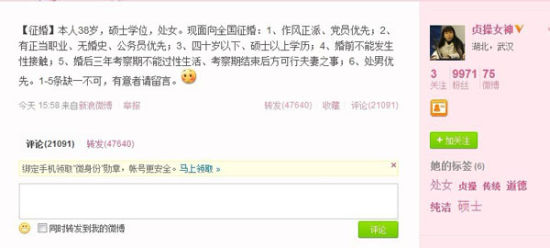 啟事說:“本人38歲,碩士學位,處女。現面向全國征婚:1、作風正派、黨員優先;2、有正當職業、無婚史、公務員優先;3、四十歲以下、碩士以上學歷;4、婚前不能發生性接觸;5、婚后三年考察期不能過性生活、考察期結束后方可行夫妻之事;6、處男優先。1-5條缺一不可,有意者請留言!