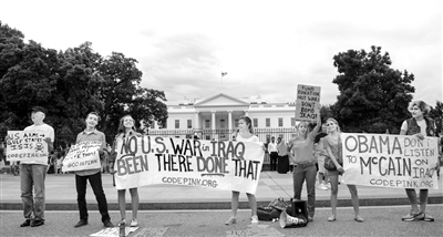8月11日,在美國首都華盛頓白宮前,一些民眾抗議空襲伊拉克。新華社記者 鮑丹丹攝