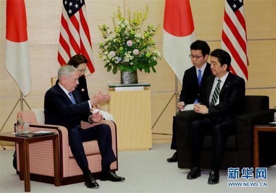 2月3日,在東京,日本首相安倍晉三(右前)與到訪的美國國防部長馬蒂斯(左前)舉行會(huì)談。