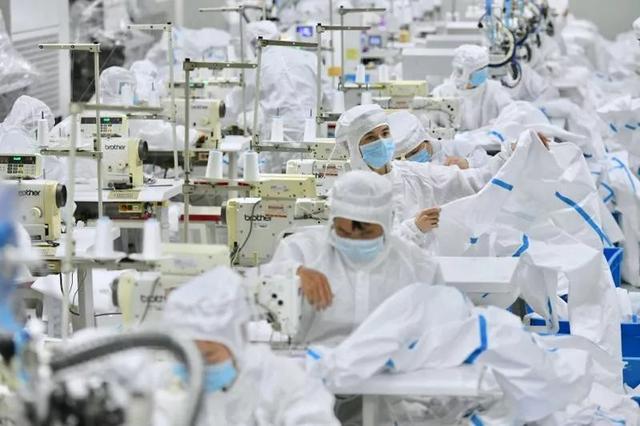 工人們復(fù)工制作防護(hù)服。(圖片來源:新華社)