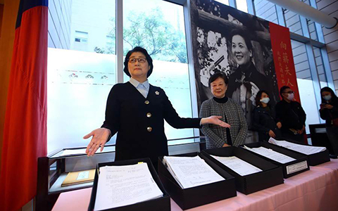 “婦聯會”主委雷倩(左)舉行記者會指出,“婦聯會”受到民進黨當局各部門聯手夾殺,并展示與各單位間的往來公文。(圖片來源:臺媒)