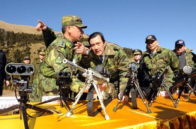 人民網(wǎng)報(bào)道:馬英九14日前往合歡山武嶺視察臺(tái)灣陸軍特訓(xùn)中心武嶺寒訓(xùn)基地,慰問(wèn)受訓(xùn)士兵并參觀特訓(xùn)中心各式雪地狙擊所使用的特殊裝備。
