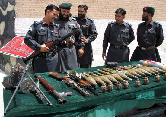 資料圖:巴基斯坦準(zhǔn)軍事部隊(duì)展示從巴阿邊境繳獲的恐怖分子的武器彈藥