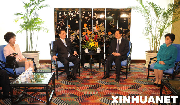 2008年11月21日,中共中央總書記胡錦濤和夫人劉永清在利馬會見中國國民黨榮譽主席連戰(zhàn)和夫人連方瑀。(圖片來源:新華社)