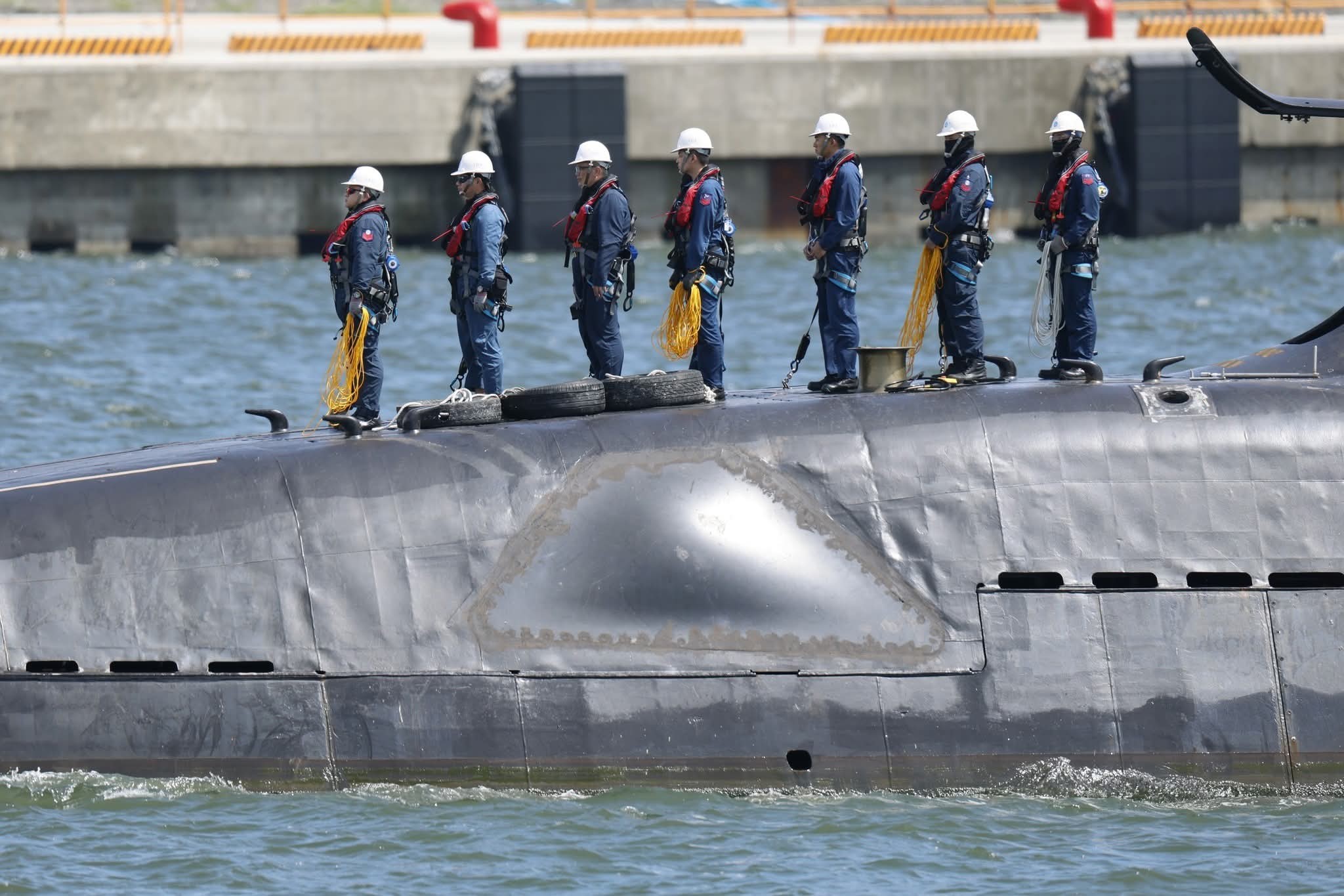 2023年9月28日,臺(tái)灣首艘自制潛艇“海鯤”號(hào)在水泥廠房?jī)?nèi),舉行了沒(méi)有沾水的“政治下水”儀式。時(shí)隔近兩年,2025年6月17日,“海鯤”號(hào)在延宕多次后,進(jìn)行了沒(méi)有下潛的海上測(cè)試。