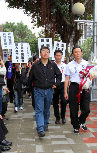 據臺灣《聯合報》11月9日報道,國民黨“立委”邱毅及臺北市議員李新等人,8日率近百人到臺北地方法院丟雞蛋抗議,同時按鈴告發審判長周占春枉法裁判,由臺北地檢署受理。