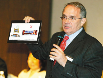 臺灣美國商會執行長魏理庭希望未來臺灣地區能出現不只會操弄民意的領導人,圖為5月底他以進口巧克力,說明臺當局兩岸政策的荒謬。《聯合報》資料照片
