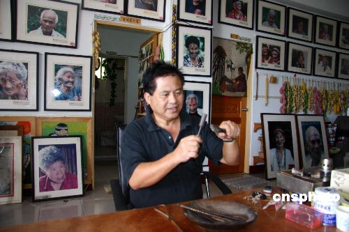 在臺灣少數民族中,唯有泰雅人有紋面(面部刺青)的習俗。然而,留有紋面的泰雅老人還健在的已不足十人。田貴實,一位敦厚淳樸的泰雅族后人,眼看這留傳千年的習俗即將完全消失,不辭辛苦地做起了研究自己族人紋面傳統的搶救工作。他在自己家里辦起了泰雅人紋面博物館。 中新社發 崔煜芳 攝