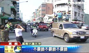 報(bào)道稱,陳水扁的防彈車再度亮相,使得臺(tái)灣民眾嗆聲變得極為容易,左邊有摩托車騎士比倒扁,陳水扁馬上撇頭,右邊又有小姐比倒扁,還有阿伯大聲罵:“不要臉!不要臉!不要臉!”