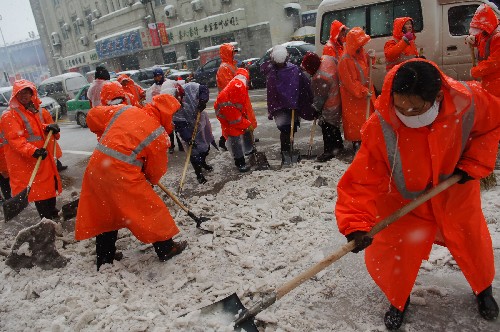 1月27日,環衛工人在清除道路積雪。當日,合肥再次降大到暴雪,造成市內道路積雪嚴重,交通受阻。為保障道路暢通和市民出行安全,合肥市各部門積極行動,武警安徽總隊合肥支隊也派出上千名官兵,同心同力,抗擊雪災。 新華社記者 李健 攝