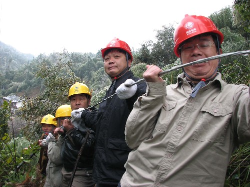 1月27日,電力職工搶修損毀線路。當日,受北方強冷空氣南下影響,福建省長汀縣遭受罕見的冰凍災害,轄區6個鄉鎮高山地帶的輸電線路因覆冰嚴重而損毀,造成約10萬名村民供電中斷。目前電力部門正在加緊搶修。新華社發(林建武 攝)