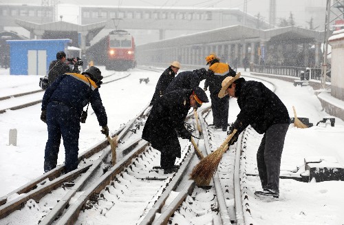 鐵道部有關負責人介紹,截至27日上午,鐵路部門已組織京廣線63列列車經京九線、三茂線、焦柳線、滬昆線迂回運行;從北京、武漢、南昌等鐵路局調集的35列客車車底全部到位。福州客運段廈門至貴陽車隊各班組啟動“惡劣天氣應急預案”,確保旅客取暖和飲食供應。上海鐵路局數萬名干部職工組成的掃雪隊伍,對道岔、站臺等關鍵處所做到雪下不停、掃雪不止,確保鐵路線路的安全暢通。杭州火車站機關和現場工作人員全部放棄休息,與武警官兵、公安干警一起維持秩序,采取措施保證乘客們有熱水喝,有熱飯吃;滯留時間過長的,安排好住宿。