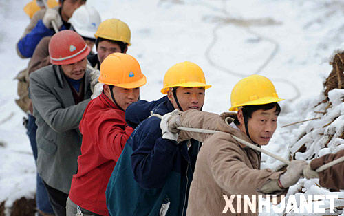 在河南新蔡縣,孫召鄉袁廟村村黨支部書記王建春帶領以共產黨員和基干民兵為主的100名突擊隊員轉移群眾和糧食。他剛剛背起年近古稀的五保戶朱三離開不到百米,土屋就被雨雪壓塌了。老人老淚縱橫:“我這條老命是共產黨給撿回來的!”在貴州省鳳岡縣,電力公司9名黨員突擊隊員冒風雨,戰嚴寒,一夜步行31公里,搶修故障線路,保障了國網的正常運行。