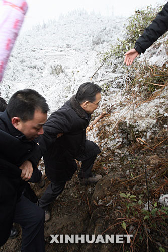 2月5日,中共中央政治局常委、國務院總理溫家寶前往貴州指導抗災救災工作。這是溫家寶踏著冰雪登上黔南觀音山,前去看望正在緊張搶修輸電線路的電力工人。新華社記者 姚大偉 攝