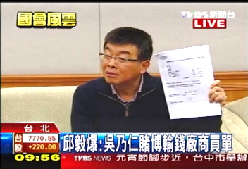 據報道,邱毅今天出示資料說,“吳乃仁當時擔任臺糖董事長,龔照勝是擔任證券交易所董事,回來以后不到半年,龔照勝就接了臺糖董事長,接著當了‘金管會主委’,吳乃仁就接了臺灣證券交易所的董事長,當時接受游戲橘子(廠商)的招待,到濟州島皇冠假日賭場賭博,輸掉的錢全都是由游戲橘子幫他們負擔,而且一賭就輸掉了200多萬港幣,這個叫小賭嗎?”