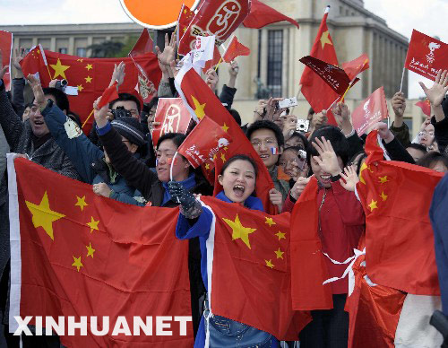4月7日,熱情的觀眾迎接奧運圣火的到來。當日,北京奧運會圣火傳遞活動在法國巴黎舉行。 新華社記者戚恒攝