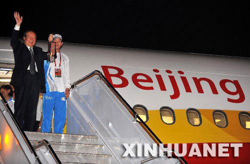 16日凌晨零時25分(北京時間16日凌晨3時25分),搭載圣火的專機降落在伊斯蘭堡軍用機場。當(dāng)北京奧運會火炬接力運行團隊總指揮、北京奧組委執(zhí)行副主席蔣效愚手持火種燈走下飛機時,現(xiàn)場響起了熱烈的掌聲。