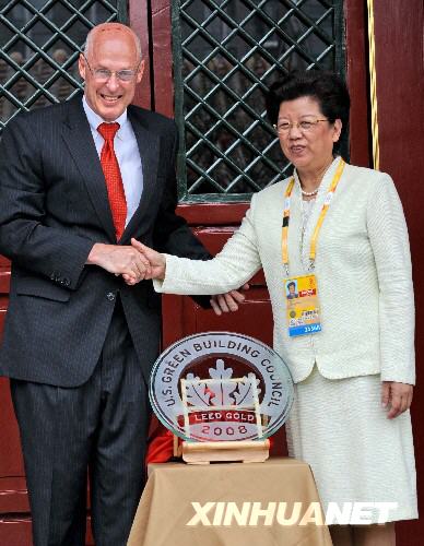 8月13日,全國(guó)人大常委會(huì)副委員長(zhǎng)、北京奧組委副主席、北京奧運(yùn)村村長(zhǎng)陳至立和美國(guó)財(cái)政部長(zhǎng)保爾森在頒獎(jiǎng)儀式上。當(dāng)日,美國(guó)財(cái)政部長(zhǎng)保爾森來(lái)到北京奧運(yùn)村,代表美國(guó)綠色建筑協(xié)會(huì)為北京奧運(yùn)村頒發(fā)綠色環(huán)保金獎(jiǎng)“能源與環(huán)境設(shè)計(jì)先鋒金獎(jiǎng)”。 新華社記者張國(guó)俊攝