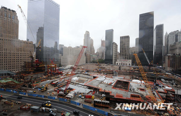 這是2009年9月11日拍攝的美國紐約世貿中心重建工程工地。當日,紐約在世貿中心舊址附近舉行“9·11”恐怖襲擊事件八周年紀念活動,遇難者的親屬、友人紛紛來此緬懷故人。 新華社記者谷欣容攝