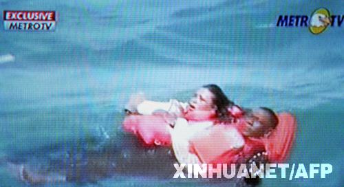 這張11月22日拍攝的電視截圖照片顯示,在靠近新加坡的卡里摩島附近,兩名遇險乘客在海上等待救援。一艘載有約250人的渡輪當天在印尼蘇門答臘島附近沉沒,目前已有97名乘客被救起,至少1人死亡,失蹤人數(shù)尚無法確定。新華社/法新