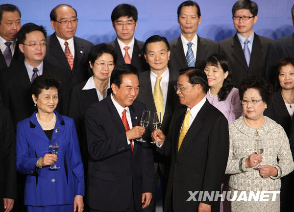 這是海協會會長陳云林(前左二)與海基會董事長江丙坤相互敬酒祝賀。新華社記者 袁滿 攝
