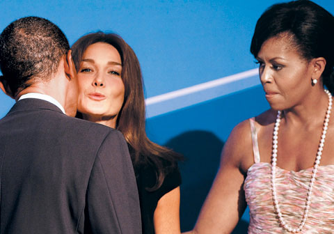 第1張雷人照片是在法國(guó)總統(tǒng)薩科齊和第一夫人布呂尼到場(chǎng)時(shí)拍攝的。當(dāng)晚,模特出身的布呂尼身穿一套墨藍(lán)色緊身禮服,她剛一進(jìn)場(chǎng)就立刻驚艷四座,成為晚宴全場(chǎng)的最大的亮點(diǎn)。顯然,奧巴馬也被美艷絕倫的布呂尼深深吸引,立即走上前與布呂尼擁抱,并在布呂尼的兩側(cè)臉頰各親吻2次,并對(duì)她說(shuō):“今天可能沒(méi)有足夠的時(shí)間和你聊了。”然而由于奧巴馬與布呂尼擁吻的時(shí)間太長(zhǎng),他身旁的夫人米歇爾只好在一旁茫然若失地等待。照片顯示,米歇爾當(dāng)時(shí)滿(mǎn)臉不悅而且神色緊張,仿佛打翻了醋壇子!