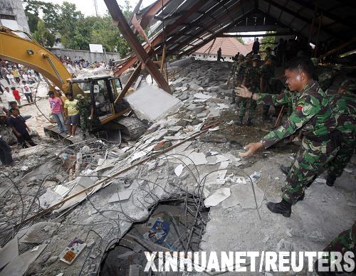 10月1日,在印度尼西亞西蘇門答臘省的巴東,士兵在一所學校中尋找遇難者。印尼西蘇門答臘省9月30日下午發生里氏7.6級地震。新華社/路透