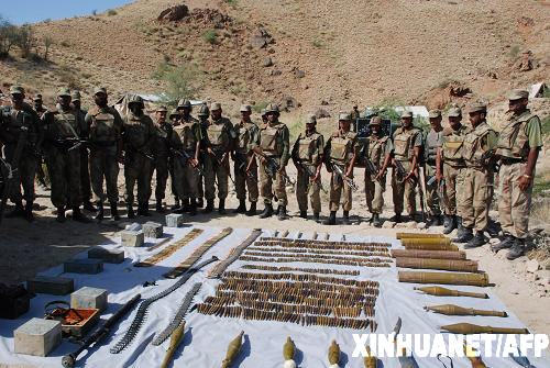 這張巴基斯坦軍方11月2日發布的照片顯示的是巴軍隊士兵展示在南瓦濟里斯坦地區進行的軍事行動中繳獲的塔利班武裝分子的武器。巴基斯坦政府軍3日稱已經包圍薩拉羅卡,現階段已將這座小鎮團團包圍,圍剿行動已經開始。巴基斯坦塔利班運動則稱,棄守薩拉羅卡為塔利班戰略,政府軍已經進入陷阱,塔利班即將反攻。新華社/法新
