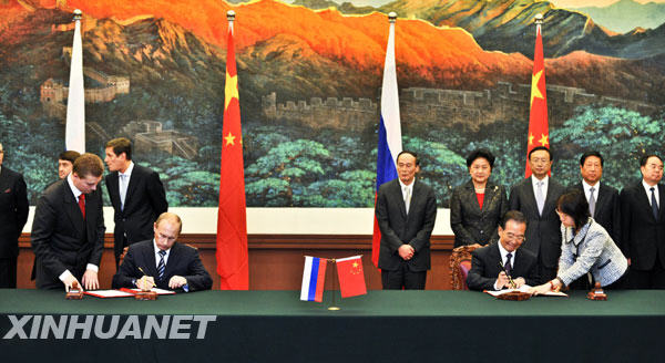10月13日,國務院總理溫家寶與俄羅斯總理普京在北京人民大會堂簽署《中俄總理第十四次定期會晤聯合公報》。新華社記者謝環馳攝