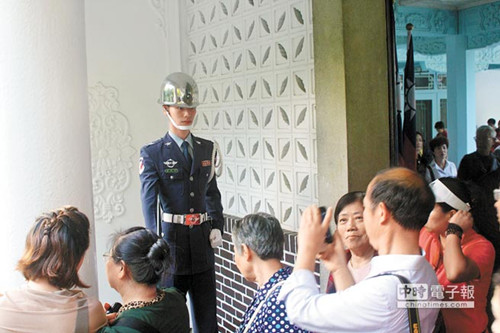 參訪團(tuán)參觀慈湖兩蔣文化園區(qū)衛(wèi)兵交接儀式。圖片來源:臺灣《旺報(bào)》
