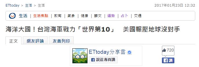 據(jù)臺(tái)灣“東森新聞云”1月23日稱(chēng),近日,一則外媒評(píng)選2017年世界前10強(qiáng)海軍的消息在臺(tái)灣引發(fā)熱議。據(jù)稱(chēng),臺(tái)灣名列第10,“屬于世界頂尖等級(jí)的海洋強(qiáng)權(quán)”。