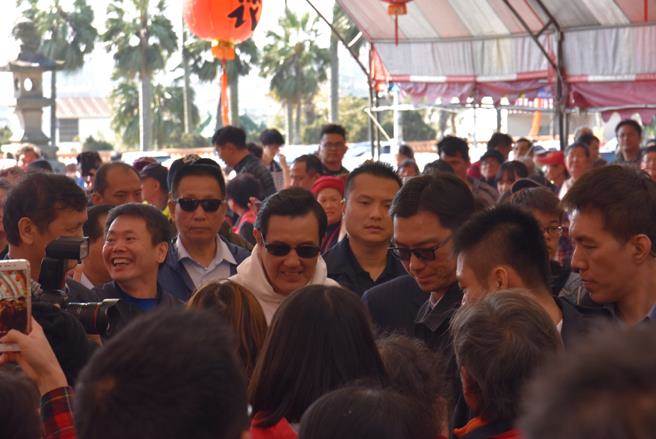 臺灣地區(qū)前領(lǐng)導(dǎo)人馬英九(白衣者)17日至新竹縣義民廟上香、贈春聯(lián),人氣不減。(圖片來源:臺灣“中時(shí)電子報(bào)”)