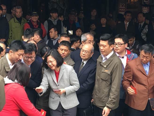 蔡英文發(fā)放紅包,臺(tái)北市長柯文哲在一旁。(圖片來源:臺(tái)灣“中時(shí)電子報(bào)”)
