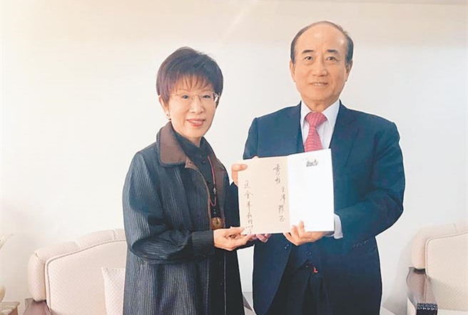 臺灣前“立法院長”王金平(右)致贈新書《橋》給前國民黨主席洪秀柱(左)。