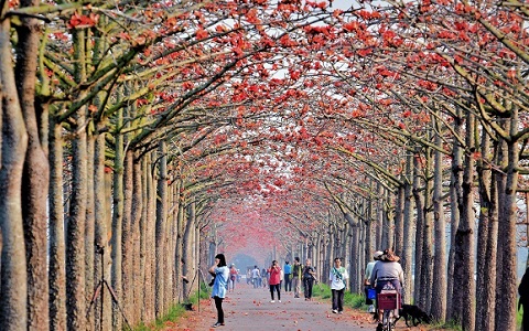 被譽為世界最美花海街道之一的臺南白河林初埤木棉花,今年受暖冬影響提早綻放,木棉道美景吸引各地游客。(圖片來自臺媒)
