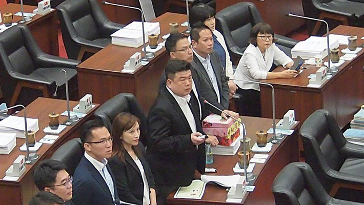 民進(jìn)黨高市議員簡煥宗6日質(zhì)詢時(shí)淚灑議場,指控韓粉揚(yáng)言對其孩子不利(圖片來源:臺灣“中時(shí)電子報(bào)”)