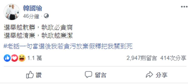 韓國瑜今(30日)在臉譜網發文,拋出20字新口號:“選舉越骯臟,執政必貪腐。選舉越清廉,執政越廉潔”,并標記“老話一句,當選后我若貪污放棄假釋,把我關到死”。