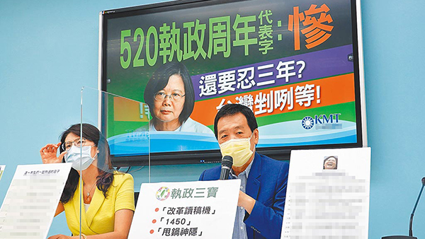 中國臺灣網5月21日訊 據臺灣“中時新聞網”報道,昨天(20日)是蔡英文連任臺灣地區領導人一周年紀念日,但蔡辦無任何談話或說明;國民黨主席江啟臣嘲諷,昨天沒有網絡上夸張的造神,蔡辦平靜地出乎意料,變成“被消失的就職周年”。國民黨也兵分多路檢討、猛批蔡英文這一年來開放“萊豬”殘害全民、關中天打壓新聞自由、黑幫執政、“慶記(子彈)”亂飛、防疫破功等不到疫苗等,全靠改革讀稿機、1450、甩鍋等法寶來執政,要求蔡英文快幡然悔悟。